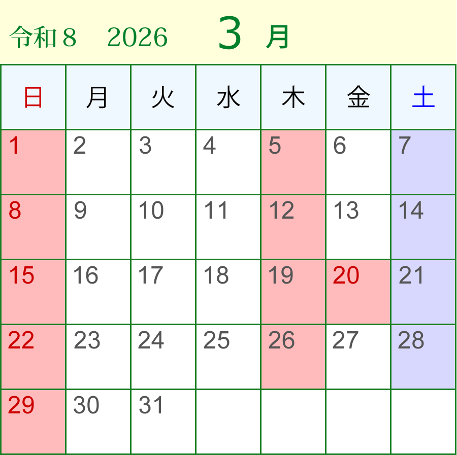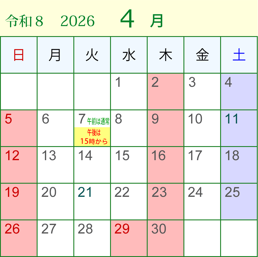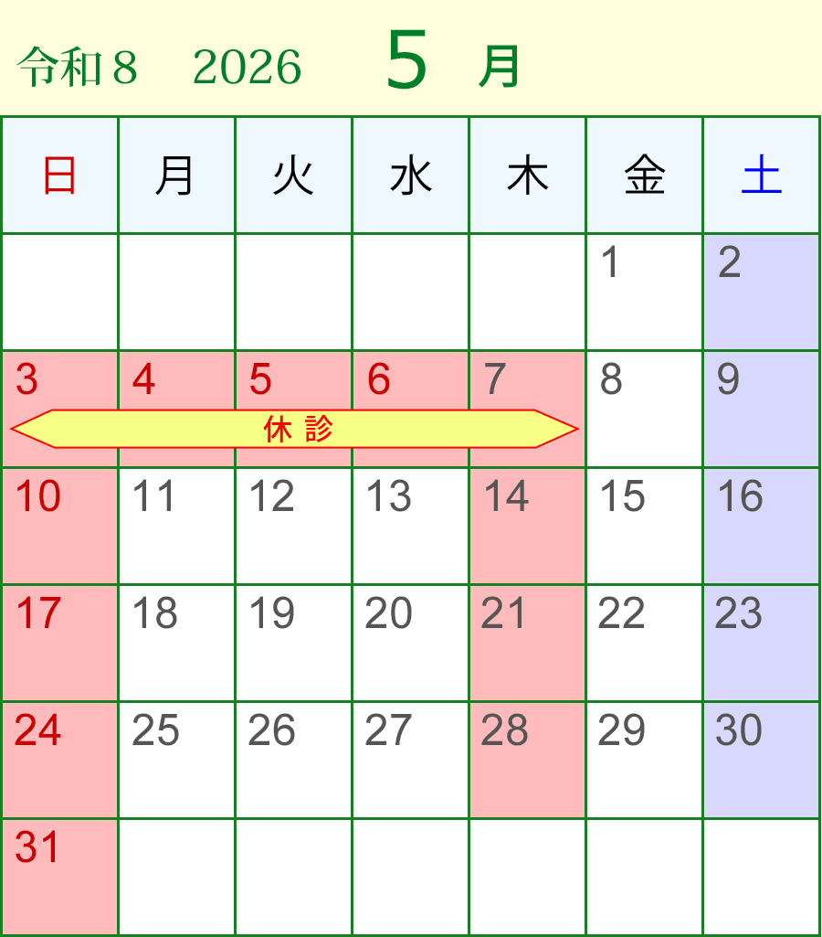 | 午後 | 院長 | 院長 | 院長 | 休診 | 院長 | 休診 | ||||||||||||